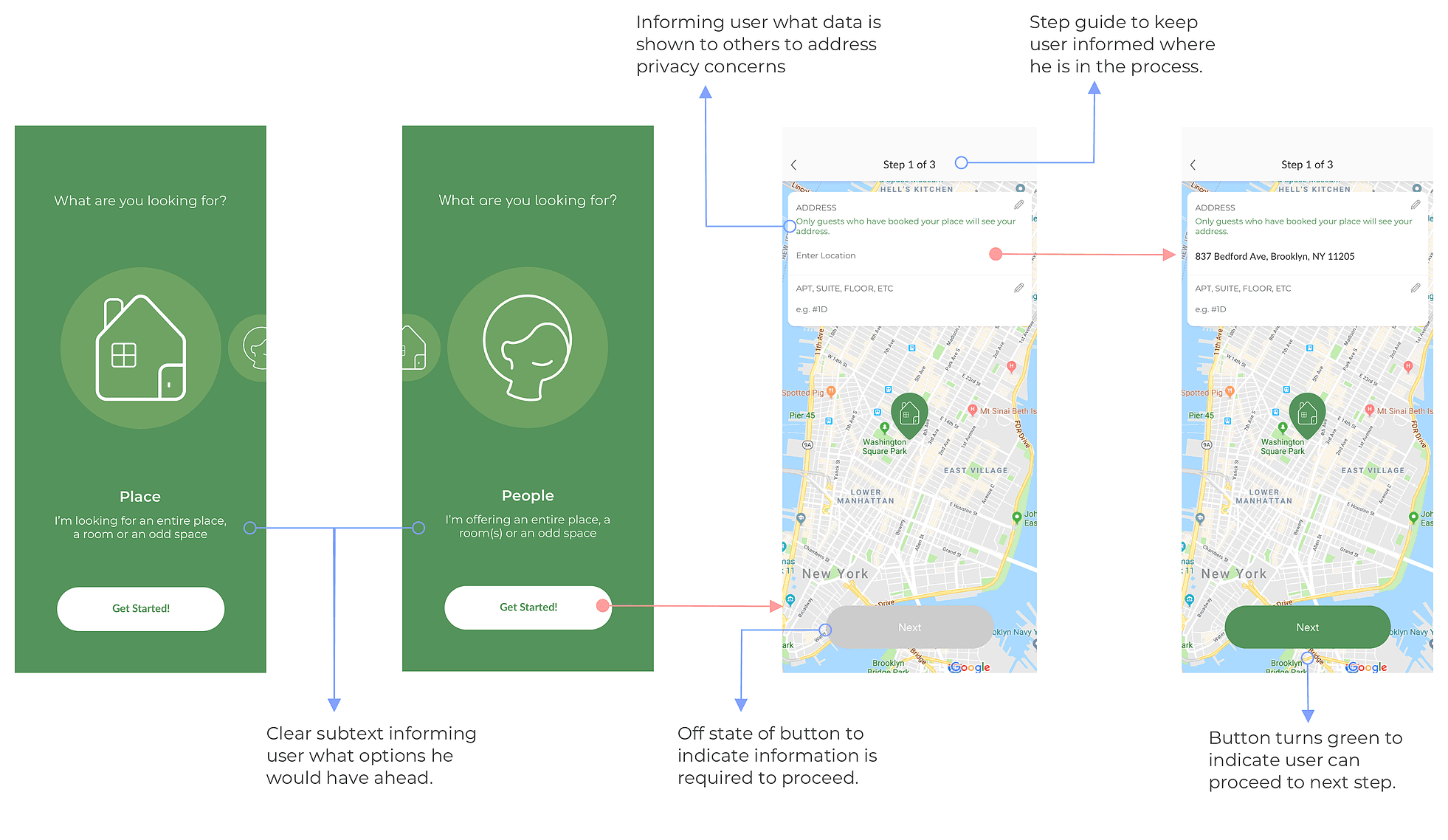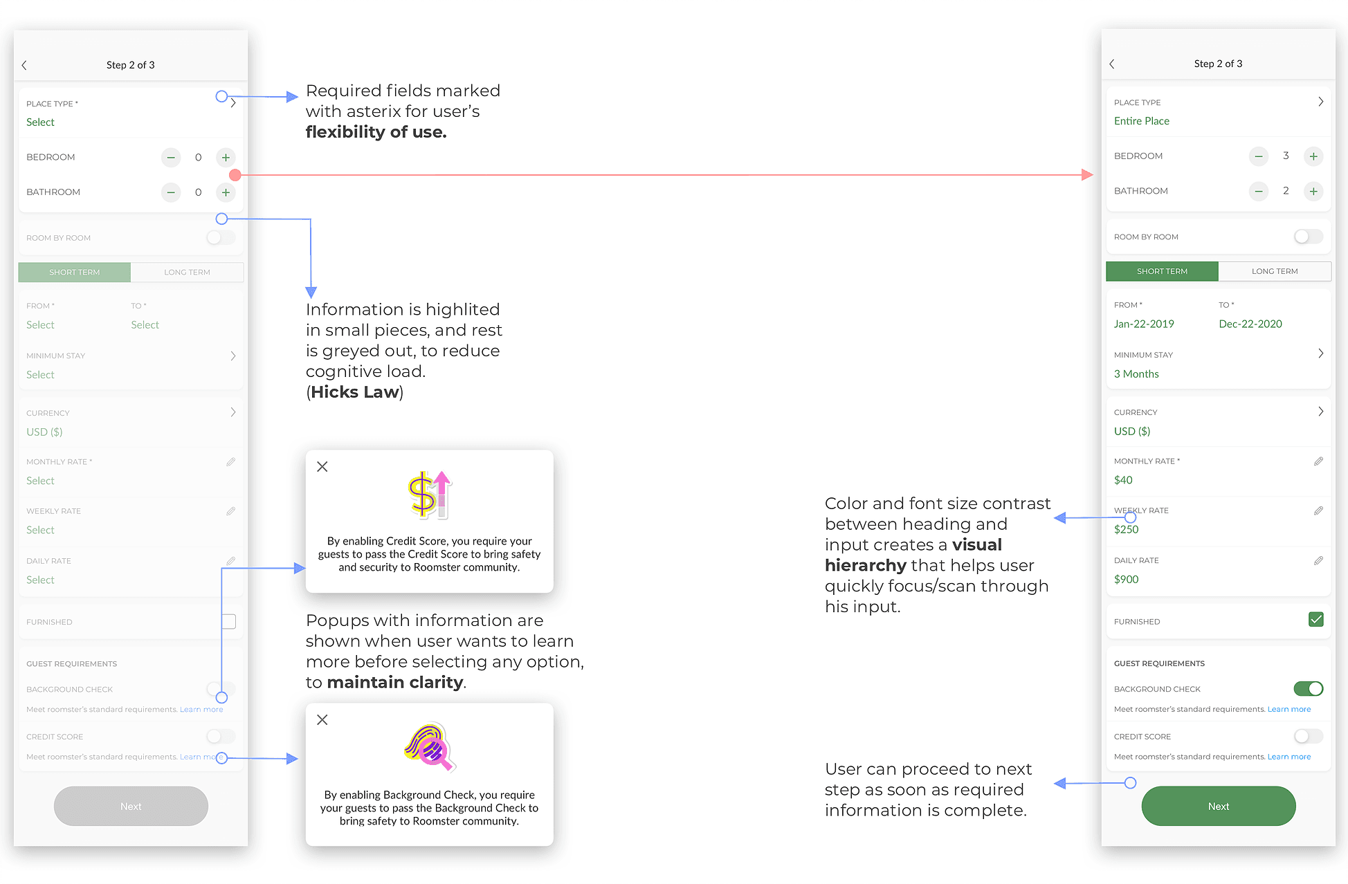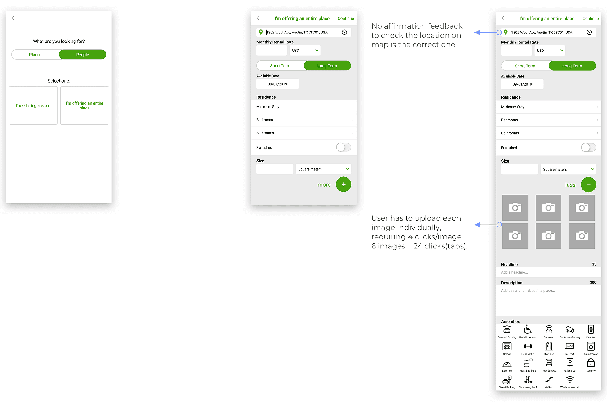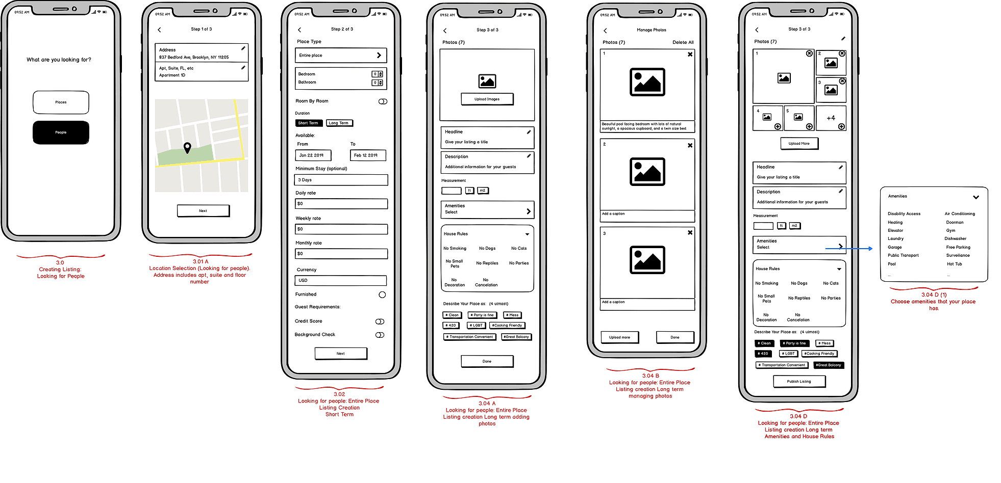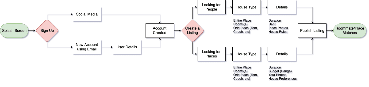 Roomster 2.0 flow was carefully researched, wireframed and tested. It was tested three times and printed for reference.